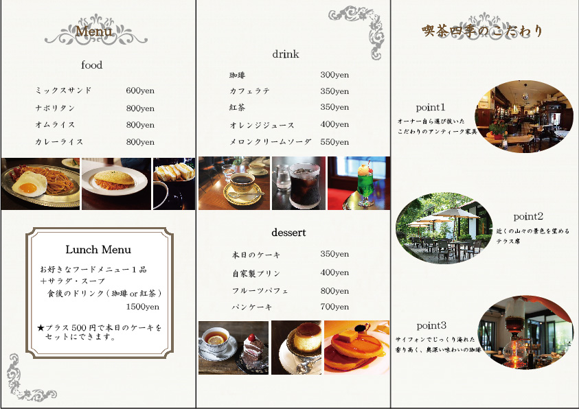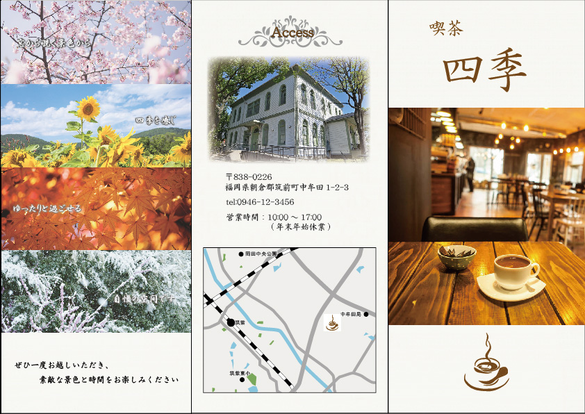 架空の喫茶店をイメージした3つ折りパンフレット。