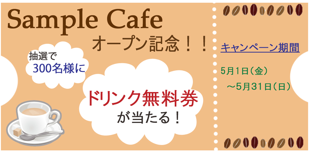 Sample Cafeという架空のカフェのオープン記念キャンペーンで、抽選300名様にドリンク無料券プレゼントというテーマ。